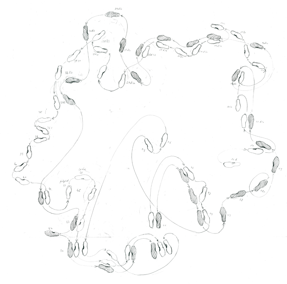 In Düsseldorf I showed my experience from China in the manner of a diagram for dancing steps, using black, white and gray footprints to map out the “movement” of the three shoes.