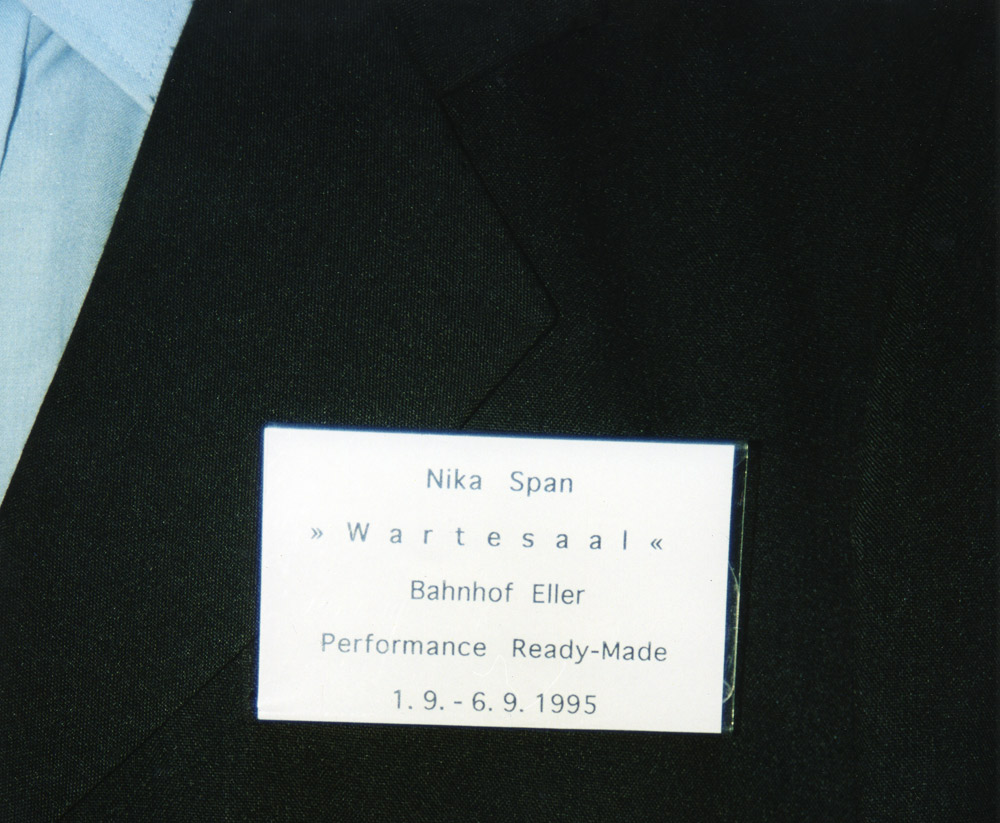 I participated a group show as a gallery guard. I spent 6 days (24 hours in total) in the exhibition space – the former waiting-room of a railway station – guarding works of my colleagues. For services rendered the gallery paid me 180 DM.
